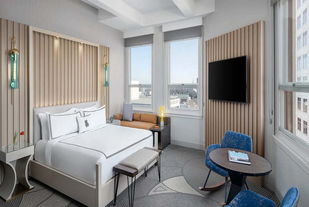 The hotel’s rooms are designed with a focus on comfort and style, featuring contemporary décor, plush bedding, and thoughtful amenities that cater to both business and leisure travelers. The high ceilings and expansive windows make the rooms feel even larger and more airy, while providing beautiful views of the city.